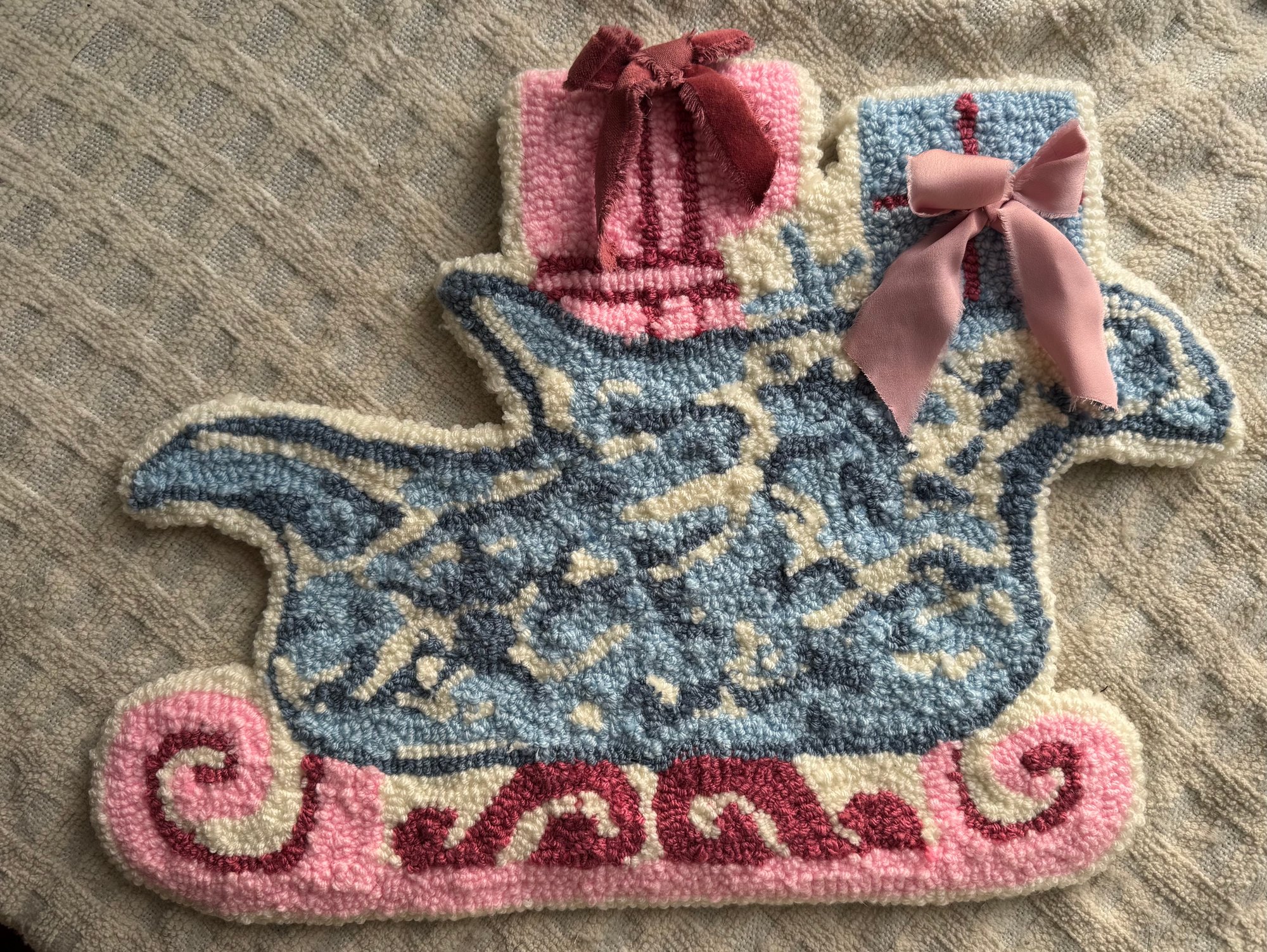 This hand tufted wall hanging measures 13” x 19”, is backed with 2 D-hooks for easy hanging.