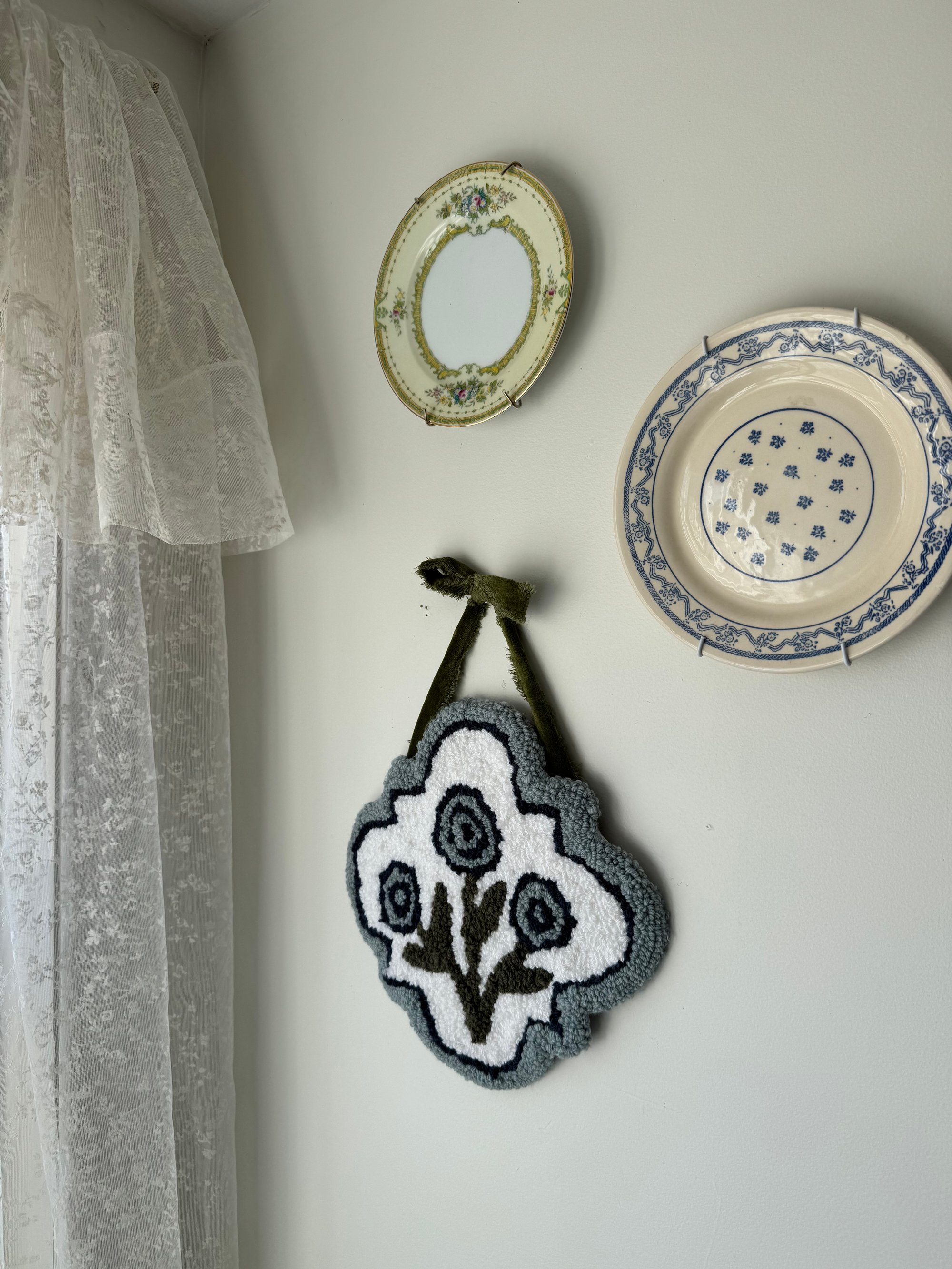 This hand tufted wall hanging measures 10” x 14” , is hung with ribbon bow.