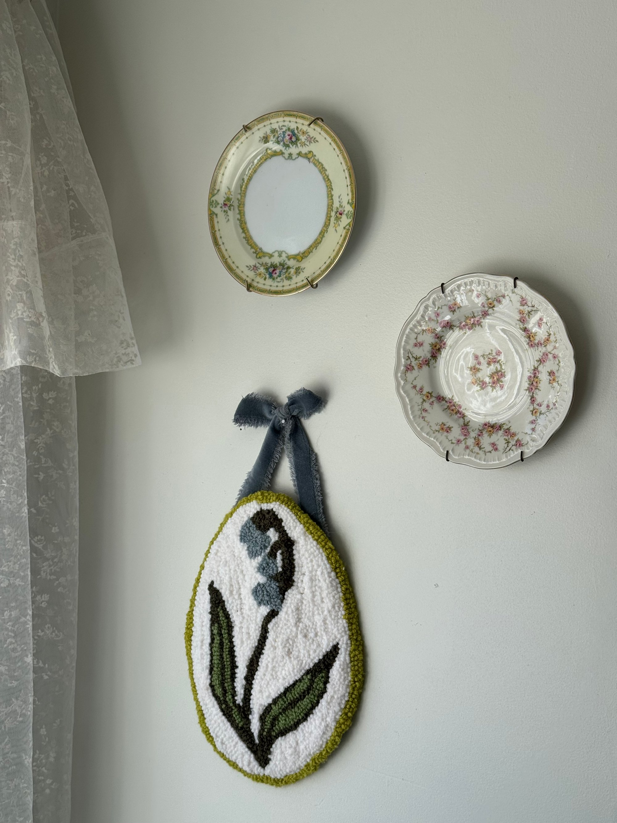 This hand tufted wall hanging measures 7” x 14”, is hung with ribbon bow.