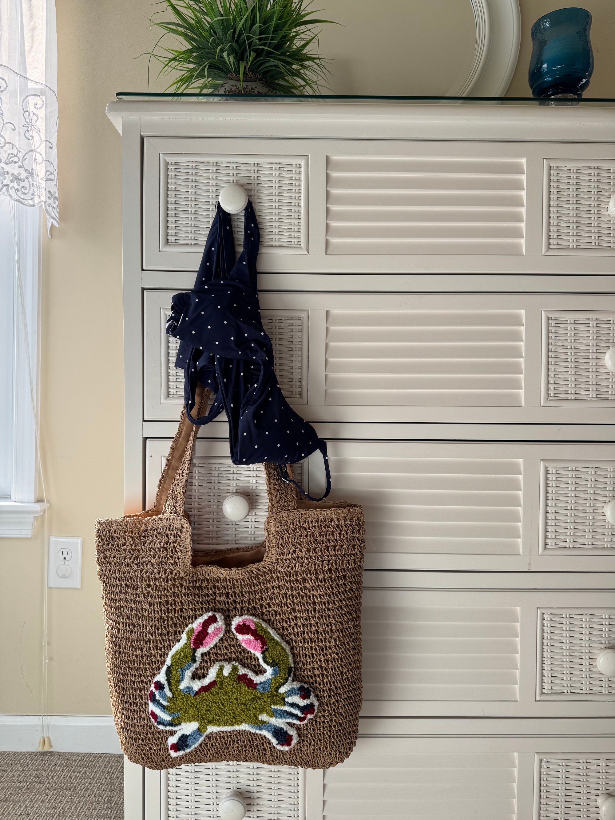 This hand tufted tote bag measures 14” x 17”.