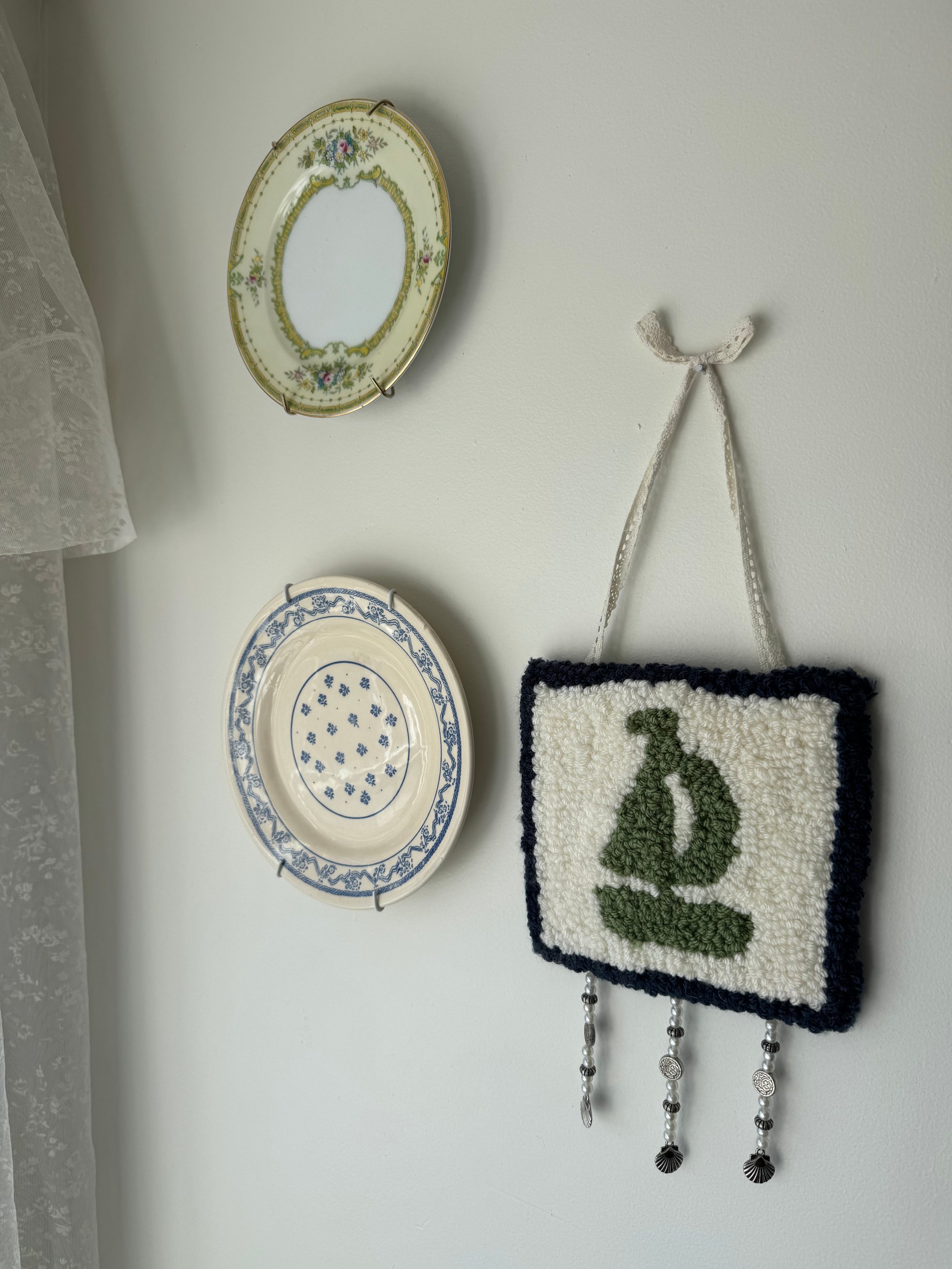 This hand tufted wall hanging measures 7” x 14”, is hung with ribbon bow.