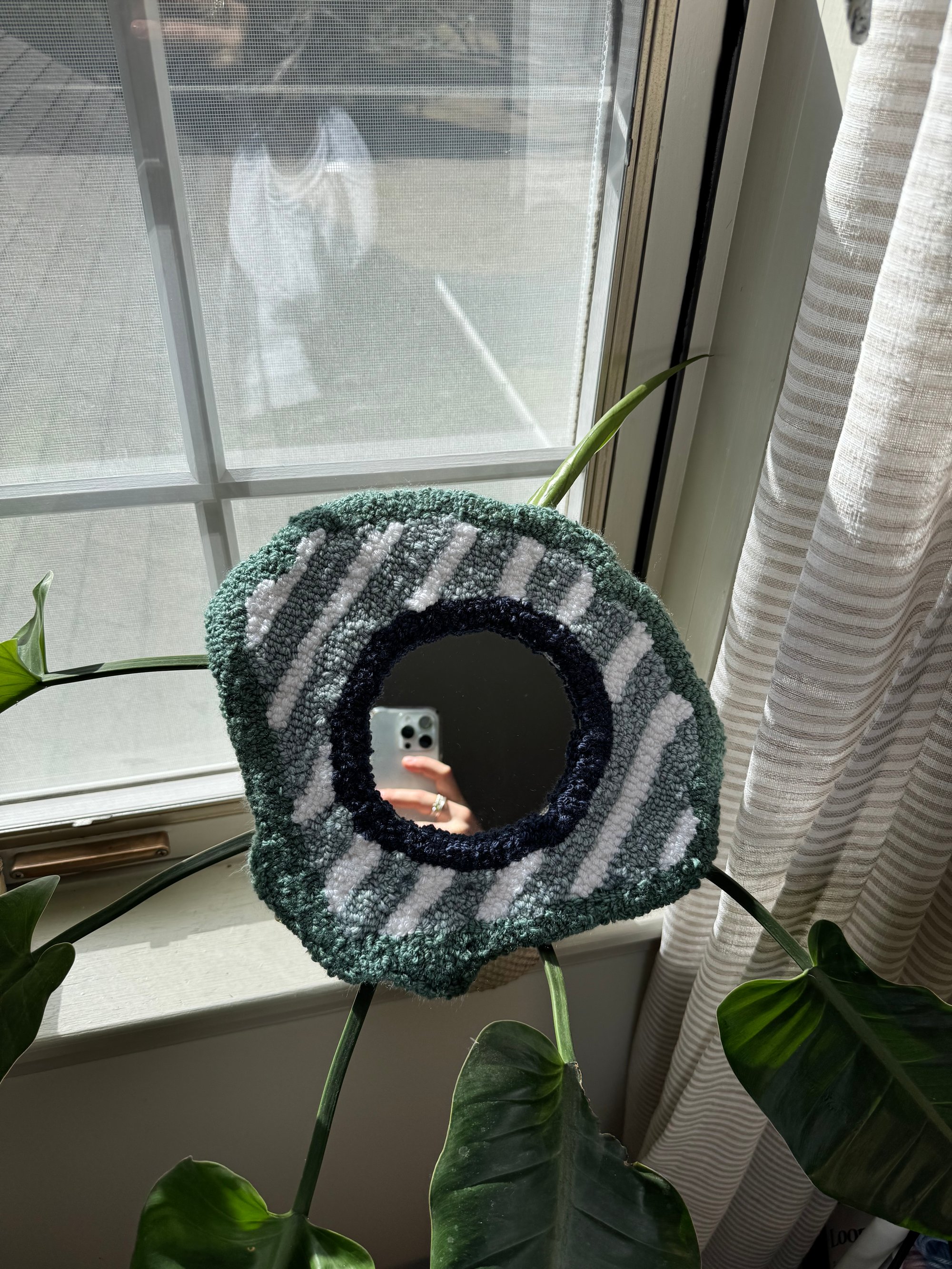 This hand tufted wall hanging measures 10” x 12”, is backed with 2 D-hooks for easy hanging.